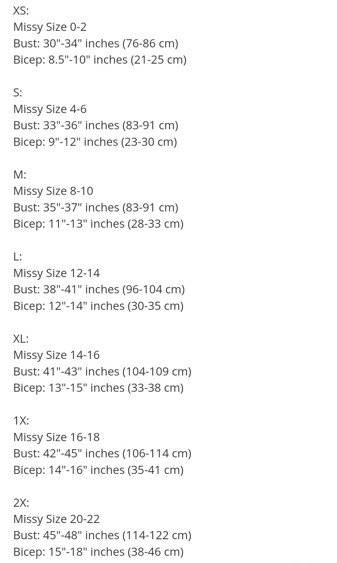 Small through 2X available. If you wear an XS, send me a message and I can order your size.